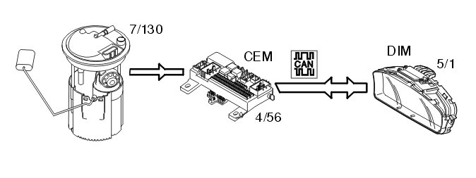 The fuel level is gauged by the fuel level sensor (7/130). The signal from the sensor is transmitted to the central electronic module (CEM) (4/56). The central electronic module (CEM) calculates the remaining quantity of fuel by comparing the signals with a tank table. Information about the quantity of fuel is transmitted via the Control area network (CAN) to the driver information module (DIM) (5/1)where the fuel level is displayed on the fuel gauge.