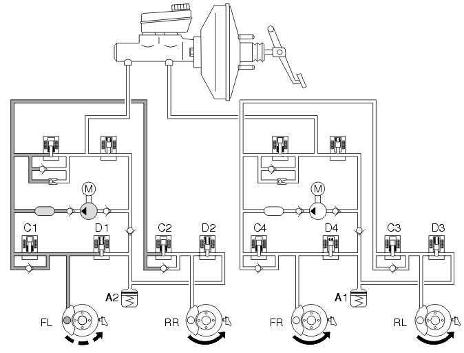 If the wheel locks anyway, the outlet valve opens and the brake fluid is allowed back to the accumulators resulting in a reduction in the brake circuit pressure (pressure release, see the left front wheel - FL). This reduces the hydraulic pressure and braking effect, allowing the wheel to accelerate. The hydraulic pump returns the brake fluid from the accumulators to the master cylinder.