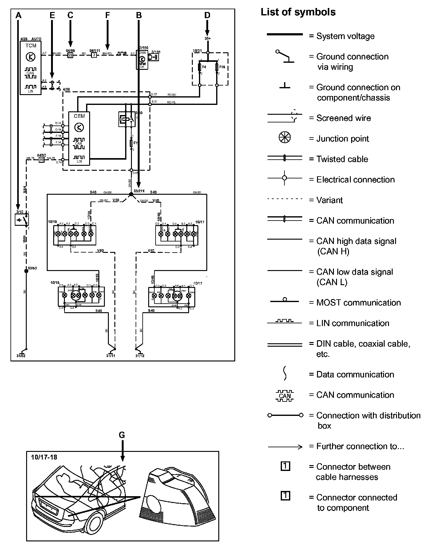 Today's cars contain CAN and MOST networks that transfer information. Connections to these networks are not shown in their entirety in the respective wiring diagram. Complete information on CAN and MOST communication is found in the "Information Bus". Electrical Diagrams