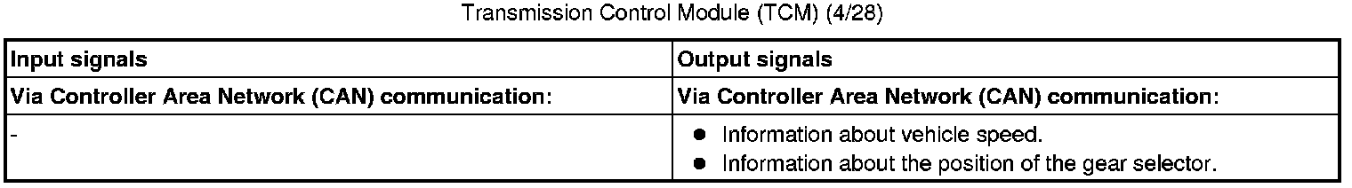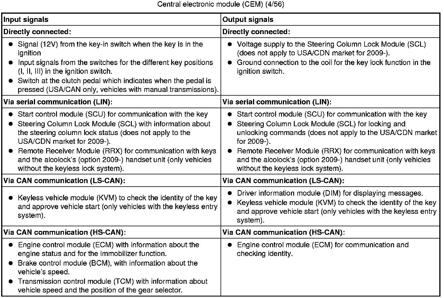 The tables below summarize the input and output signals to the units in the system for the immobilizer. The signal types are divided into directly connected signals, serial communication and controller area network (CAN) communication.