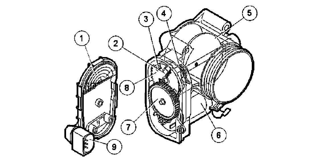 The electronic throttle unit consists of a round throttle disc on a shaft. This is turned using a DC motor (damper motor), gear wheel and two springs, an opening spring and a return spring. The damper motor is controlled by the control module and is supplied with powered by a built in power stage in the control module. At one of the limit positions the throttle disc is closed so that no air can pass the throttle unit. At the other limit position the throttle disc is parallel to the air flow so that the air is able to freely pass through the throttle unit. The throttle disc shaft is mechanically connected to two built-in potentiometers (position sensors) which are supplied with power by the control module. The signals from the potentiometers provide the control module with data about the position of the throttle disc. The throttle unit also has a connector with six gold plated terminal pins.