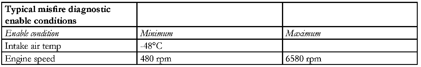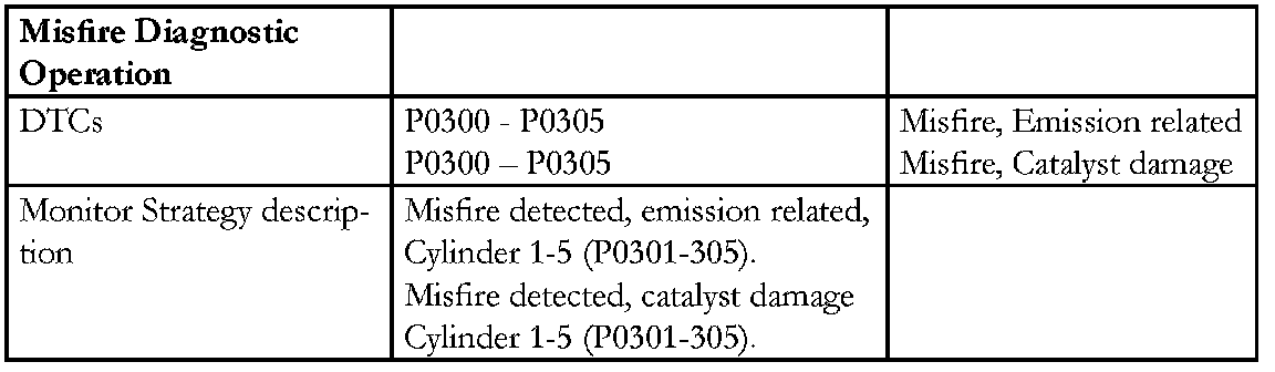 Misfire detection is enabled when the engine speed has reached 150 rpm below warm idle speed plus two crankshaft revolutions or after nine ignitions, depending on which occurs first. For detection of emission related misfires, the number of misfires which have occurred within the first interval of 1000 engine revolutions or the 4th exceedance (for the rest of DCY) over the emission threshold value after the first 1000 engine revolutions are relevant. If the number is so high that the exhaust emission standard is exceeded by a factor of 1.5, then the emission related misfire rate has been reached and exceeded a fault code will be stored. If misfires occur and the threshold is exceeded in the following DCY, MIL illuminates.