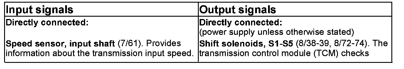 The table summarizes the input signals to and output signals from the Transmission Control Module (TCM). The signal types are divided into directly connected signals, serial communication and Controller Area Network (CAN) communication. The following illustration displays the same information with the Volvo command designations.