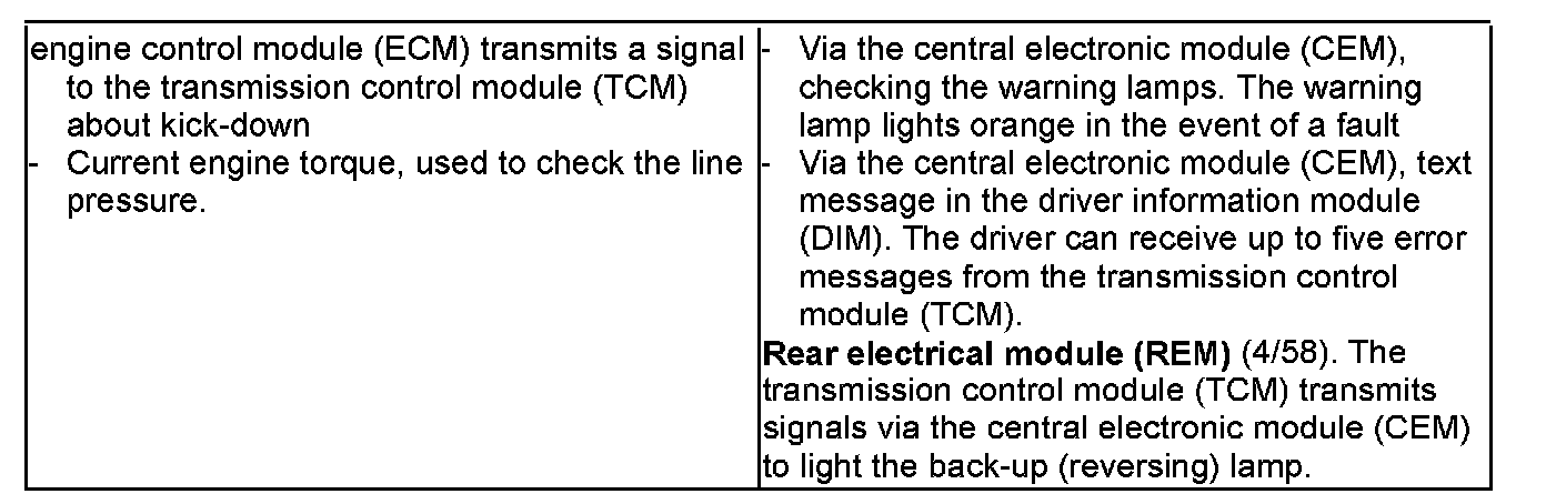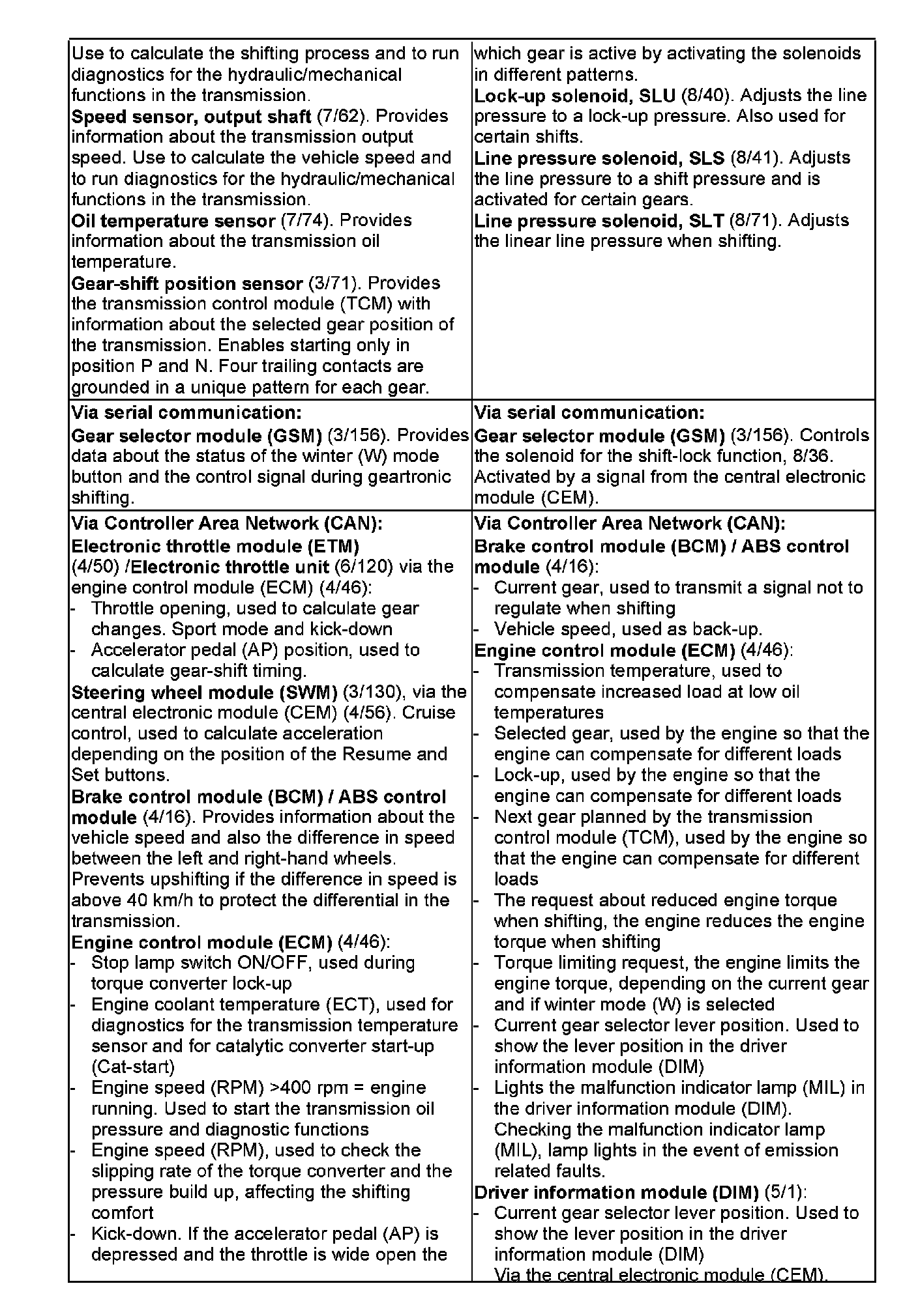 The Transmission Control Module (TCM) adapts the gear changes to ensure that the correct gear is selected for the driving mode, engine load, driver requirements, speed etc. This gives good fuel economy combined with increased comfort by ensuring smoother gear changes and lower noise levels. The Transmission Control Module (TCM) receives information about the desired gear position and driving mode from the driver. In conjunction with the signals from a number of sensors in the transmission and the engine control system, unlike with a purely hydraulically controlled transmission, this allows the control module to calculate the optimal shifting points and engagement of lock-up. The control module allows for small changes in the operating conditions and adapts the various transmission functions to ensure that the correct gear is always selected in relation to the driving mode selected by the driver.
