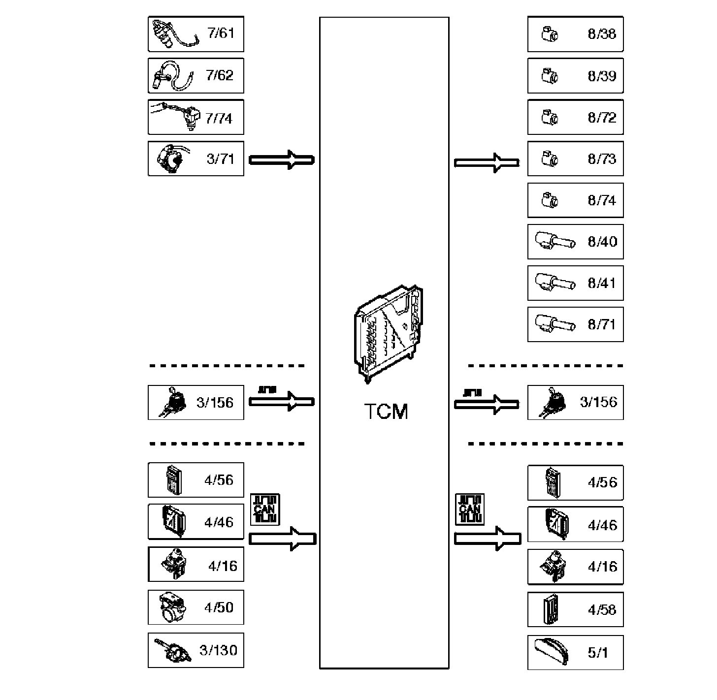 - Transmission Control Module (TCM)-Controls activation and deactivation of the solenoids by processing the signals from components such as the transmission input and output speed sensors and the temperature sensor. Also stores adaptive data as well as Diagnostic Trouble Codes (DTCs) and frozen values for diagnostics