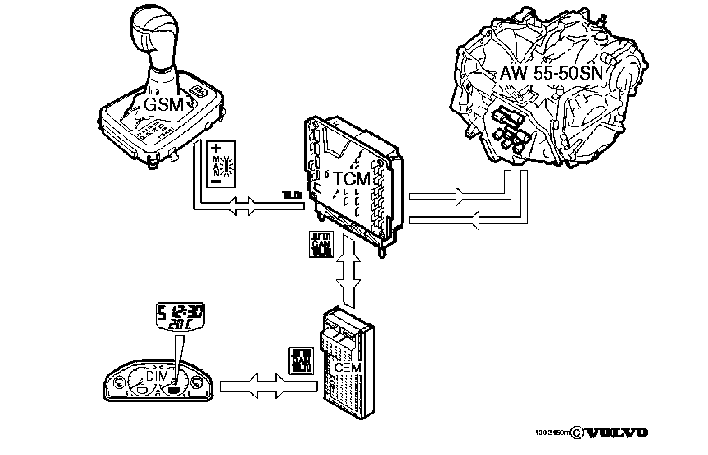 The transmission control module (TCM) is positioned in an air cooled plastic box in the engine compartment together with the engine control module (ECU).