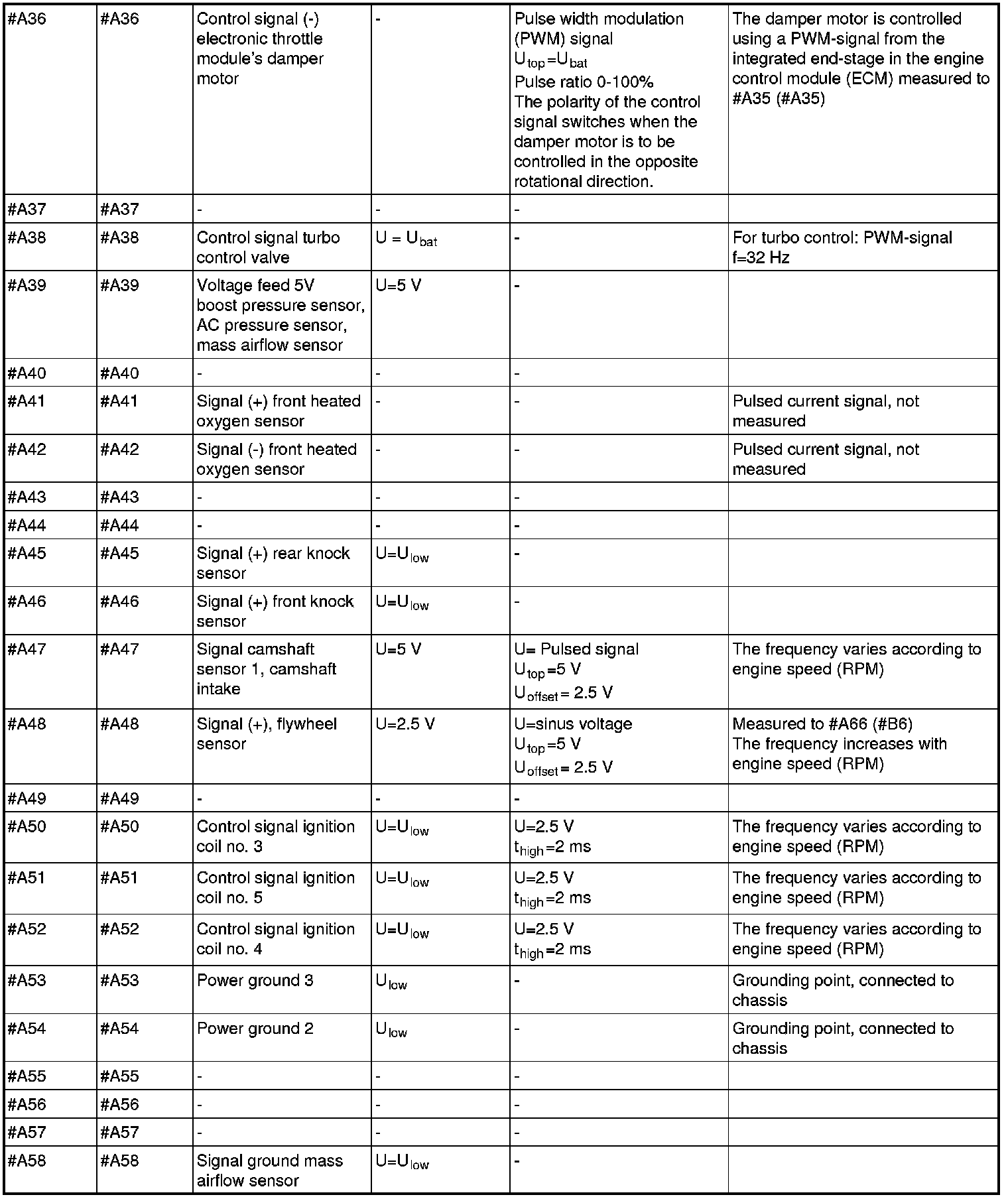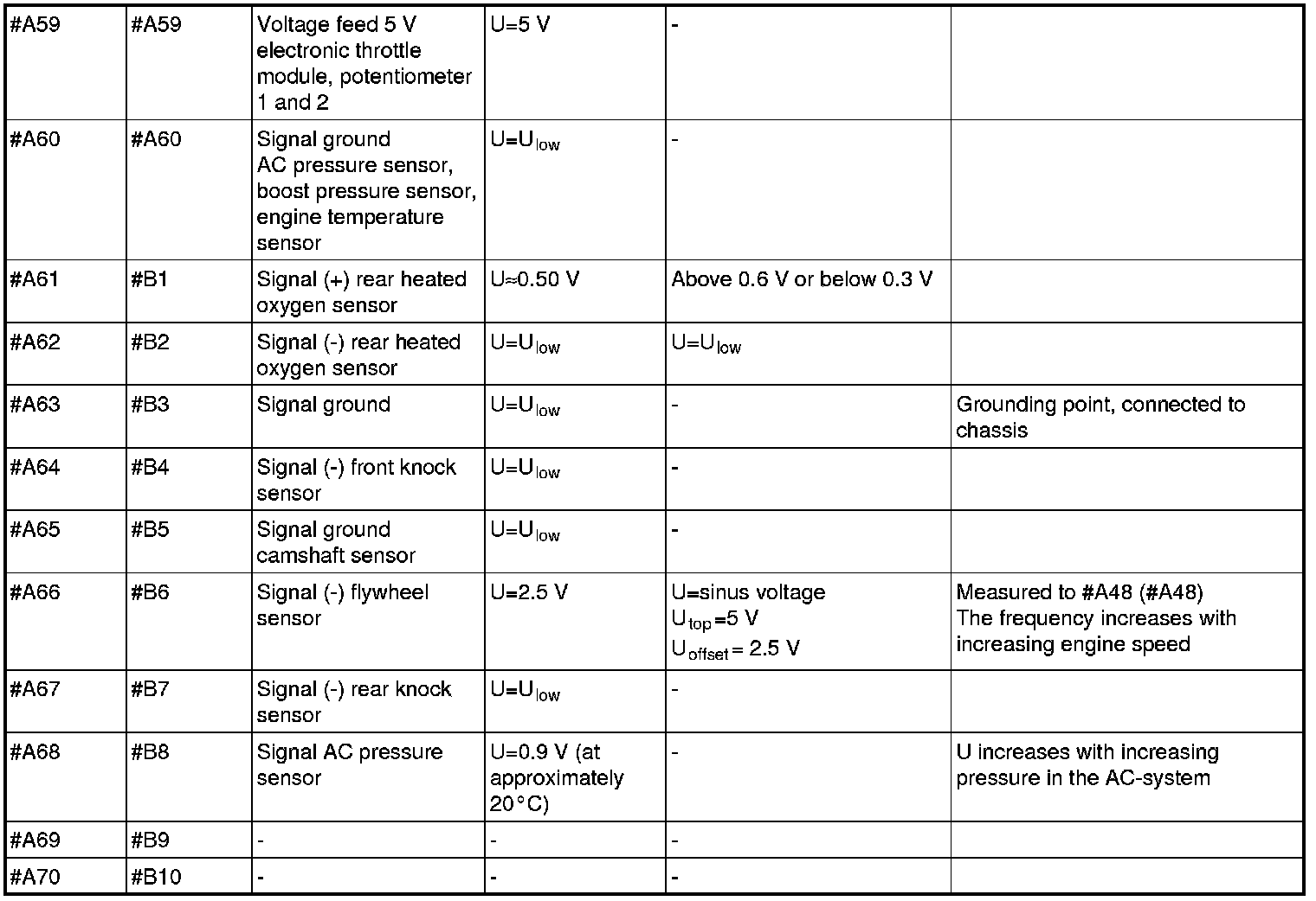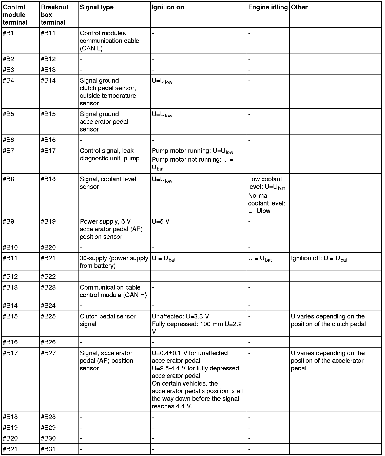 All values stated below are measured between each connection in column 1 (Conn. control module) and breakout box connection #B3 unless otherwise noted in column 6 (Other). The control module's connections #A1-#A70 correspond to #A1-#B10 on the breakout box, #B1-#B50 correspond to #B11- #B60 on the breakout box.