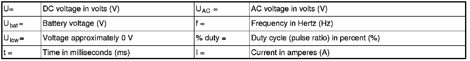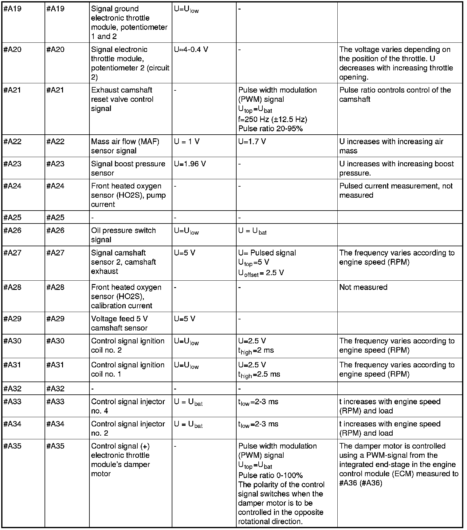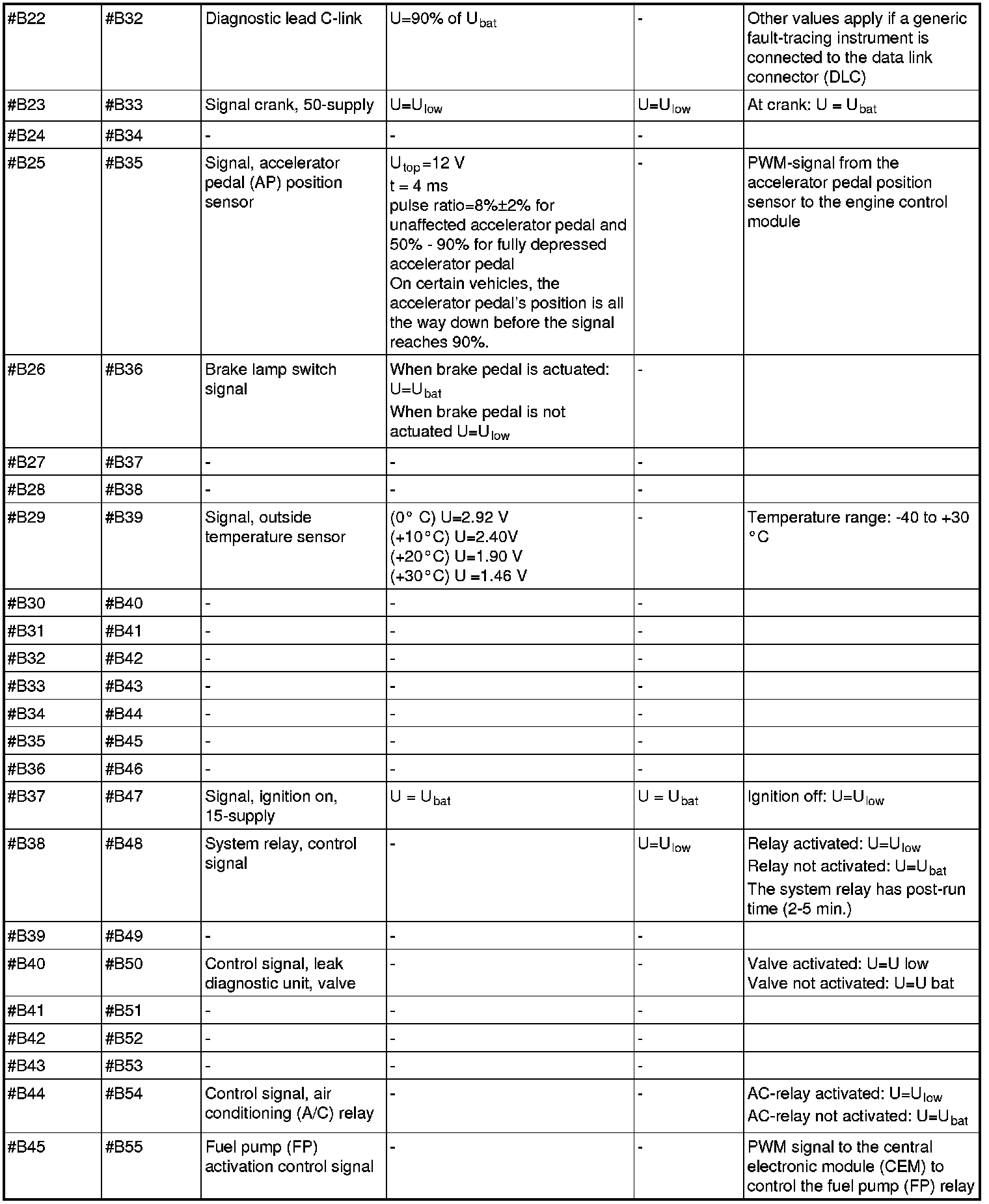 All values stated below are measured between each connection in column 1 (Conn. control module) and breakout box connection #B3 unless otherwise noted in column 6 (Other). The control module's connections #A1-#A70 correspond to #A1-#B10 on the breakout box, #B1-#B50 correspond to #B11- #B60 on the breakout box.