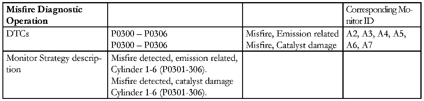 Misfire detection is enabled when the engine speed has reached 150 rpm below warm idle speed plus two crankshaft revolutions or after nine ignitions, depending on which occurs first.For detection of emission related misfires, the number of misfires which have occurred within the first interval of 1000 engine revolutions or the 4th exceedance (for the rest of DCY) over the emission threshold value after the first 1000 engine revolutions are relevant. If the number is so high that the exhaust emission standard is exceeded by a factor of 1.5, then the emission related misfire rate has been reached and exceeded a fault code will be stored. If misfires occur and the threshold is exceeded in the following DCY, MIL illuminates.