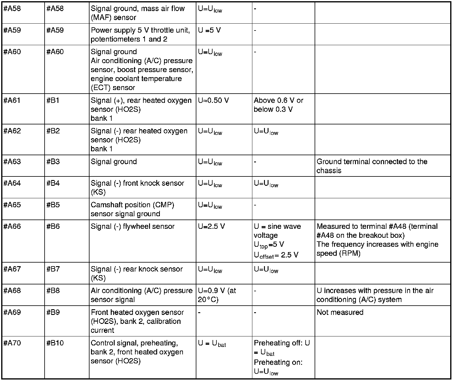 All values listed below should be measured between the respective terminal in column 1 (control module terminal) and terminal #B3 unless stated otherwise in column 6 (Other). Control module terminals #A1-#A70 correspond to terminals #A1-#B10 on the breakout box, terminals #B1-#B50 correspond to #B11 - #B60 on the breakout box.