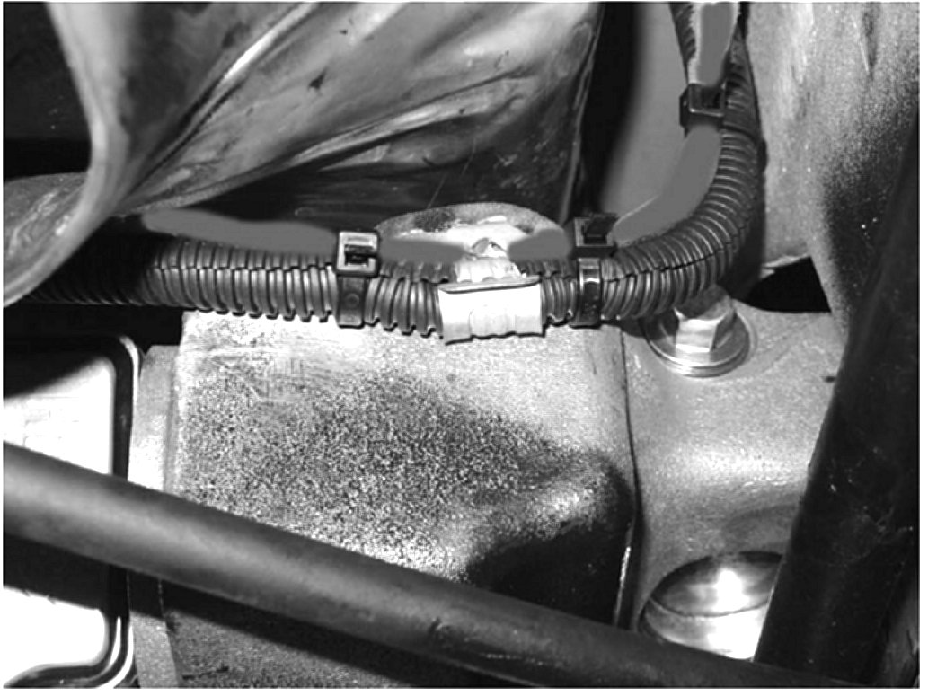 Install plastic cable ties as shown to secure ground cable and ensure that it will not vibrate or contact moving parts.