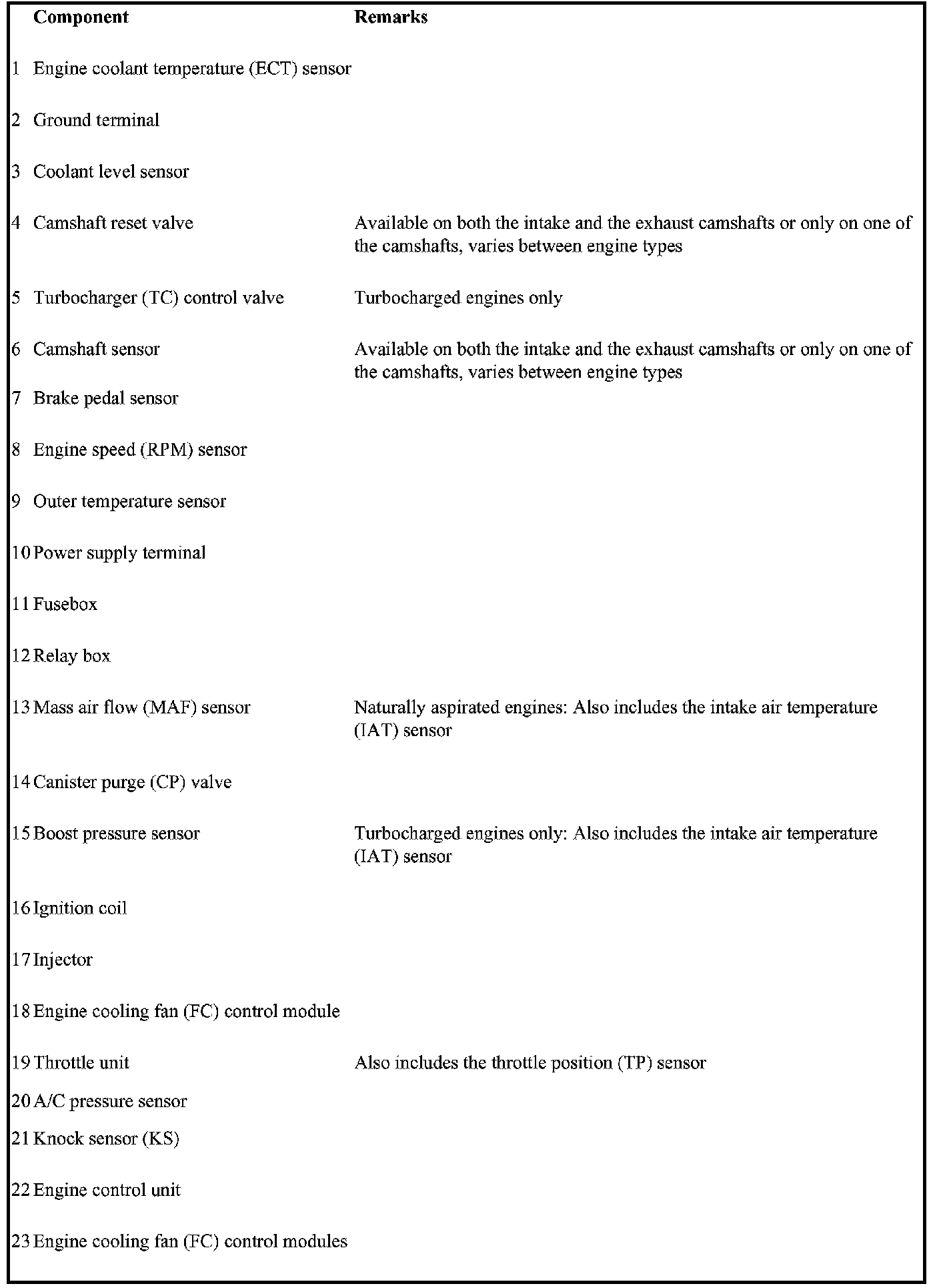 Not all the following components are necessarily in the car. The components vary between engine types.