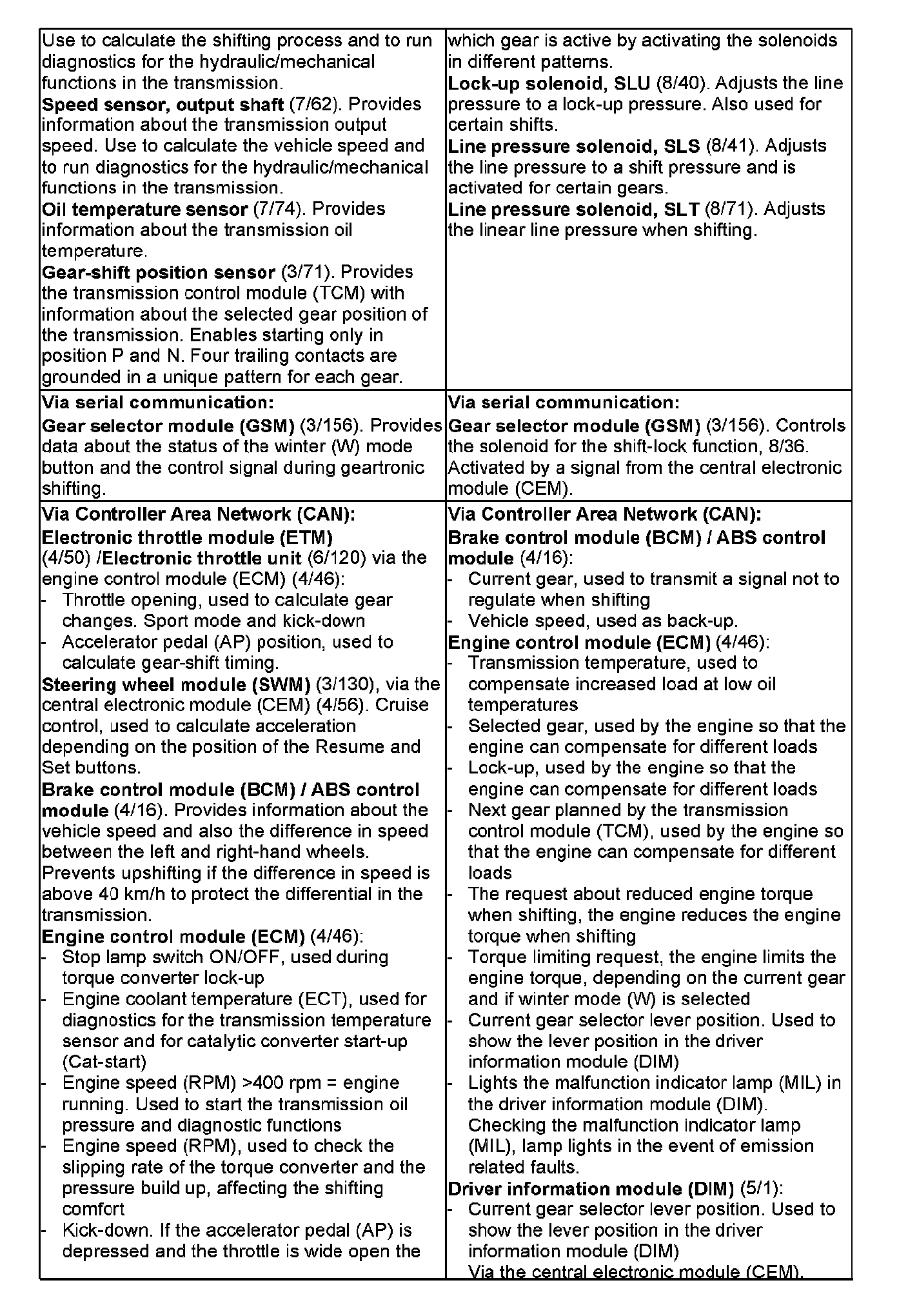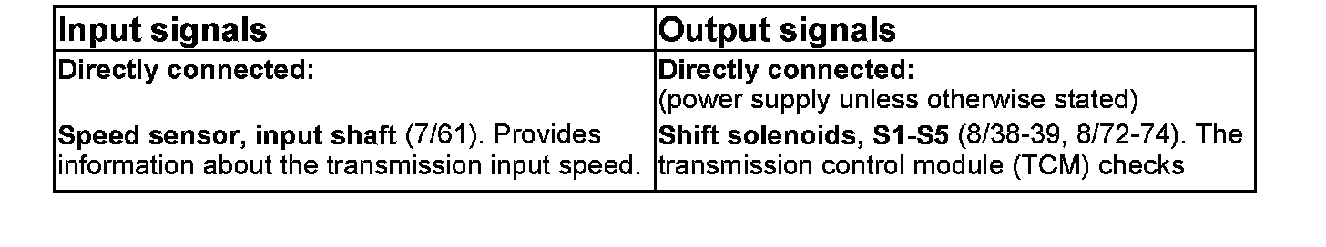 The tables summarize the input signals to and output signals from the transmission control module (TCM). The signal types are divided into directly connected signals, serial communication and Controller area network (CAN) communication. The following illustrations display the same information with the Volvo component designations.