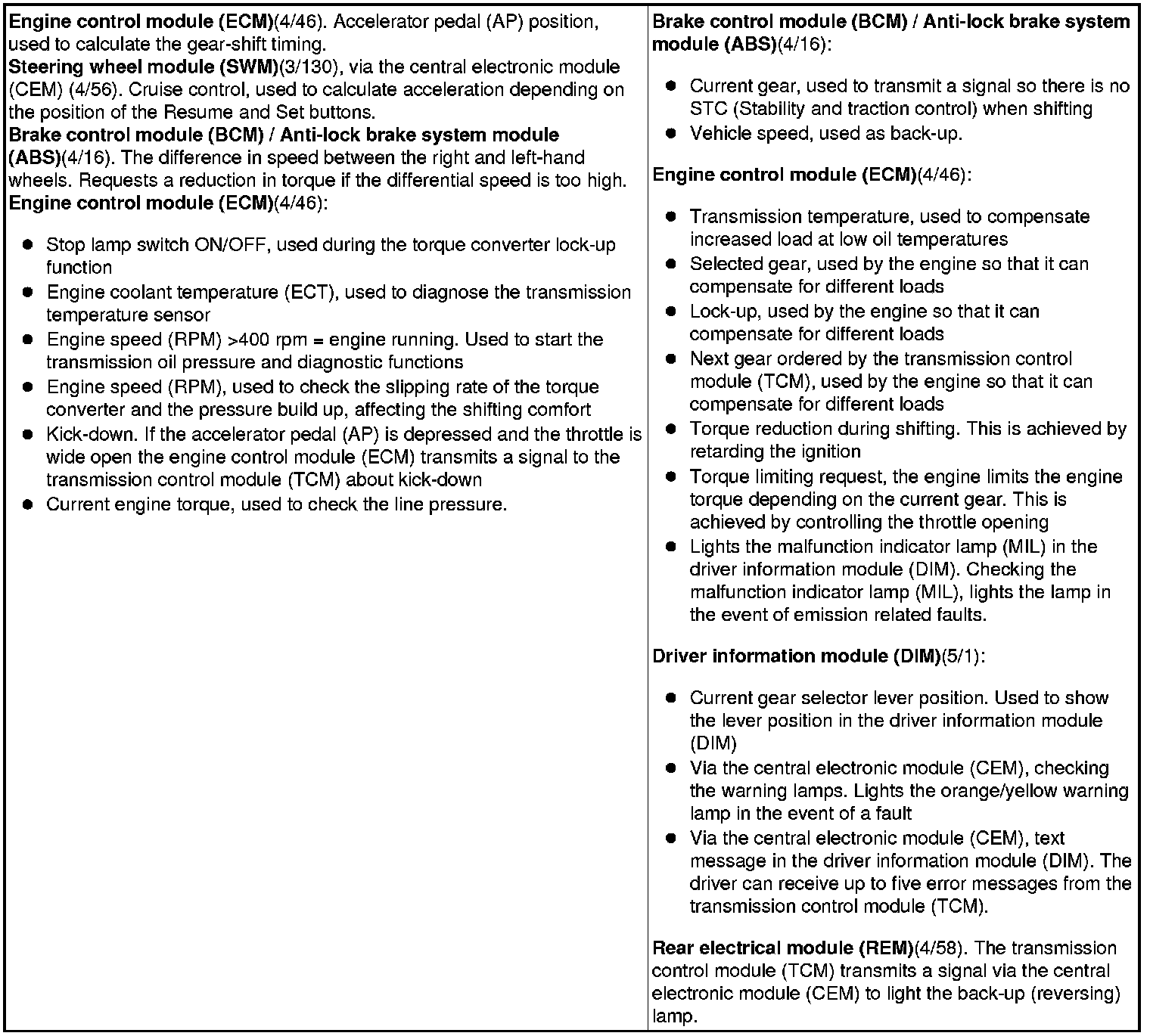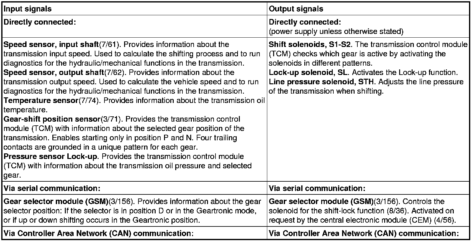 The table below summarizes the input signals to and output signals from the transmission control module (TCM). The signal types are divided into directly connected signals, serial communication and Controller area network (CAN) communication. The following illustration displays the same information with the Volvo component designations.
