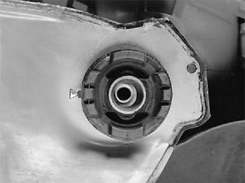 NOTE: The left-hand rear bushing on the subframe is a different version to the other three bushings. The hole in the center of the bushing is oval. The oval must be positioned lengthways to the car, as illustrated.