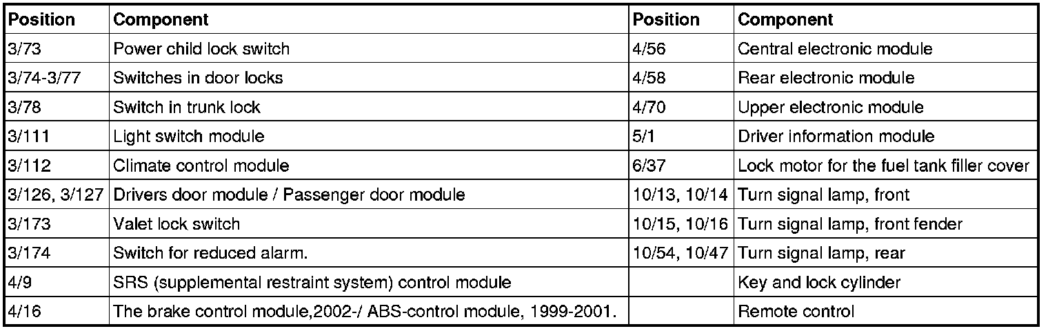 The number of switches, electrical motors in the door and relays, differs depending on the model year, version and type. The same control modules are used in different versions. The software differs on the type of lock, locking system and model. It is possible to shift between single step unlocking and two step unlocking by downloading new software.