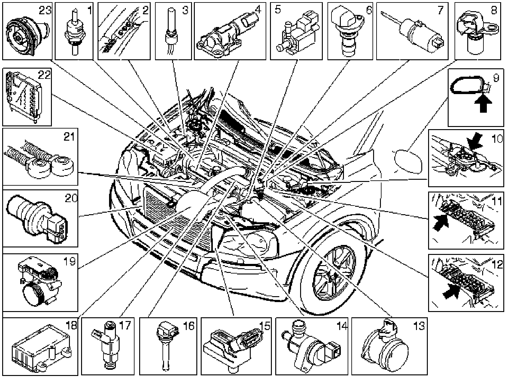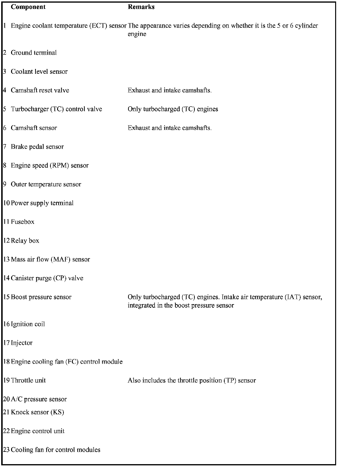 Not all the following components are necessarily in the car. The components vary between engine types.