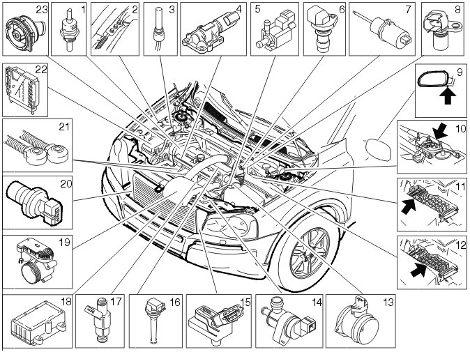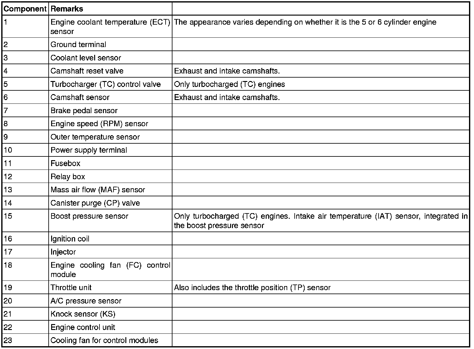 Not all the following components are necessarily in the car. The components vary between engine types.