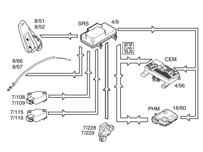 The control module also transmits a collision signal on a directly connected cable to the central electronic module (CEM) (4/56) and the phone module (PHM) (16/60), so that these control modules can take certain actions.