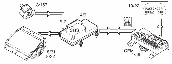 When the ignition key is turned from 0 to I, II or III, the communication on the controller area network (CAN), the status of the internal functions in the supplemental restraint system module (SRS) (4/9) as well as all directly connected components are checked: