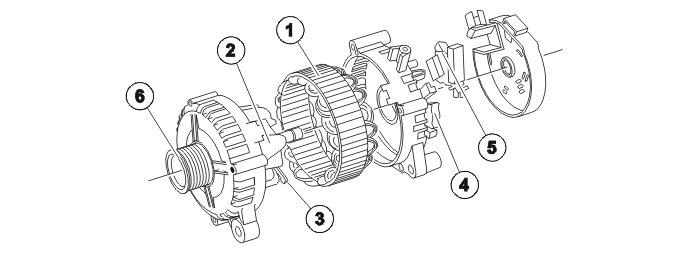 The stator windings generate three phases and are delta connected An exciter diode is connected to each of the three stator windings. The six rectifier diodes are bridge connected. The diodes are pressed into a diode holder.