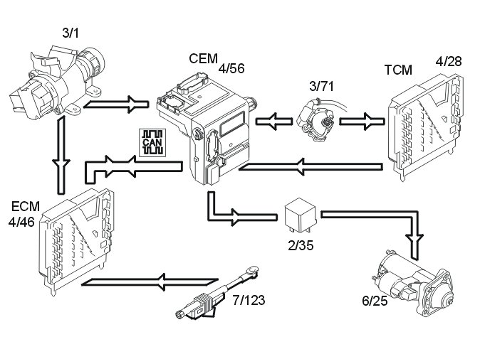 - For transmissions with a clutch interlock (certain markets), a signal is transmitted from the ignition switch to the engine control module (ECM) (4/46). The engine control module (ECM) detects the position of the clutch pedal sensor (7/123). The engine control module (ECM) transmits data to the central electronic module (CEM) (4/56) via the control area network (CAN) about the position of the pedal. The central electronic module (CEM) requires a signal that the clutch is pressed down and that the key is in position III before it will send a signal to the relay (2/35). When the relay is activated, the solenoid in the starter motor is powered