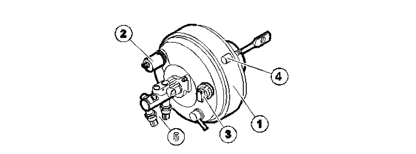 The power brake booster is positioned on the firewall in the engine compartment. It consists of a vacuum cylinder (1), pedal position sensor (2), pressure build-up valve (3) and pedal pressure sensor (4). The pressure build-up valve and the pedal pressure sensor (activation unit) have a common connector which cannot be replaced.