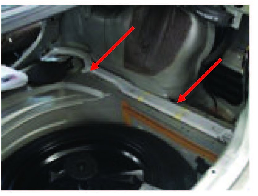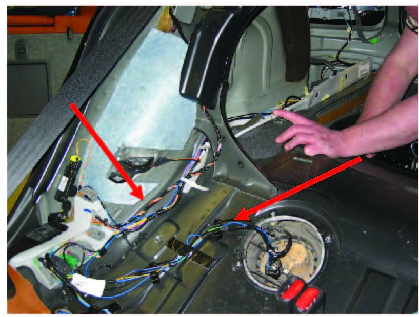 Access the cable harness between the rear control module (REM) and the right-hand inspection cover for the fuel tank. See VIDA for information. Depending on model, this will include removal of trunk floor, trunk side panels, plastic cover along inside bottom of trunk, and right rear seatback. Remove the inspection cover (at arrows in photo) over fuel pump connector.