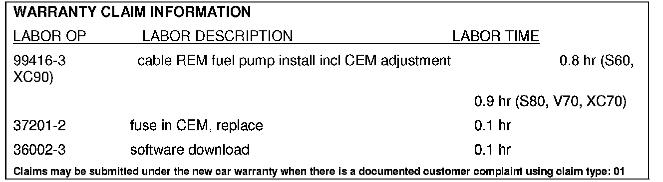 Certain S60, S80, V70, XC70, and XC90 vehicles use a demand-controlled fuel system with a fuel pump control module (FP control module, or Pump Electronic Module [PEM]) and a fuel pump with two pump motors. The fuel system design was modified in production during the summer of 2006. Each motor within the pump was given its own fused electrical circuit.