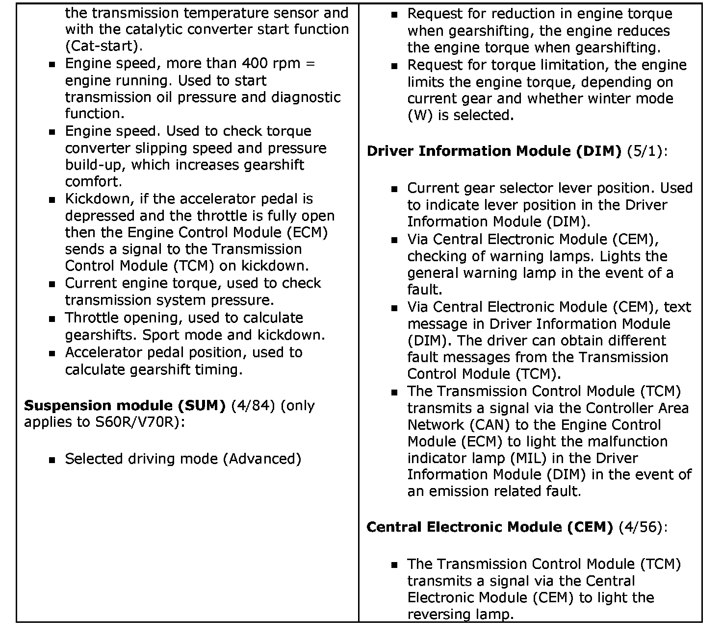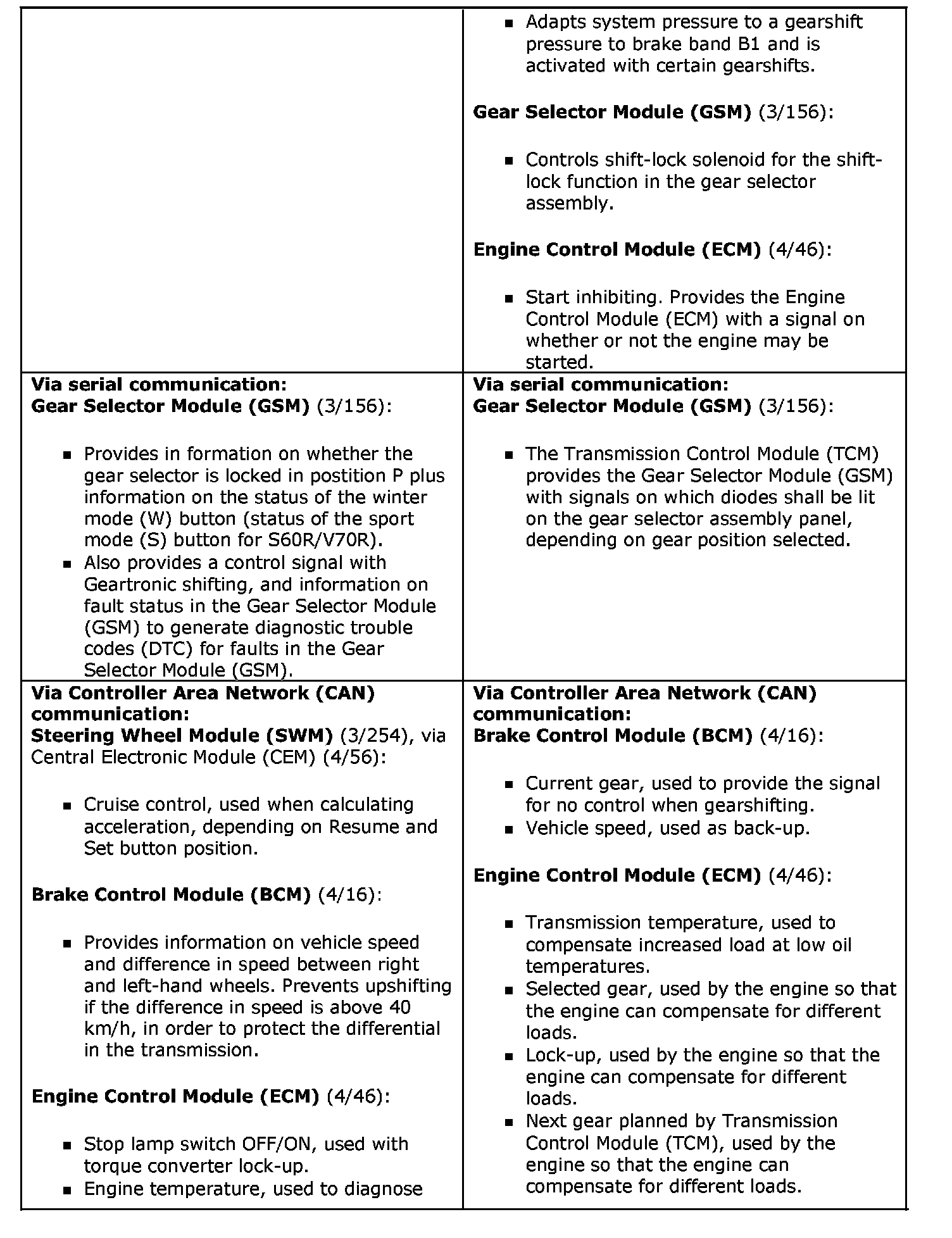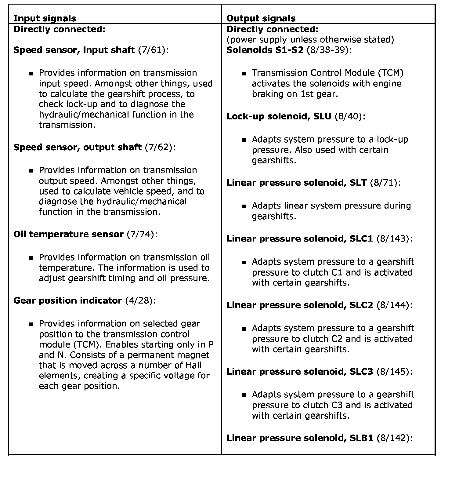 The table below summarizes the input and output signals to and from the Transmission Control Module (TCM). The signal types are divided into directly connected signals, serial communication and Controller Area Network (CAN) communication. The illustration below displays the same information with the Volvo component designations.