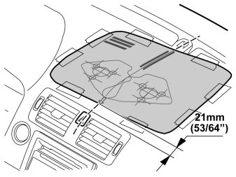 - Place the template with the lower edge 21 mm (53/64") from the top edge of the air outlet and centered along a line between the button for the warning flashers and the LED.