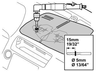 - Predrill the holes according to the template using a -5 mm (13/64") drill bit. Fit a 15 mm (19/32") drill stop. Drill square to the dashboard where the holes are to be positioned.