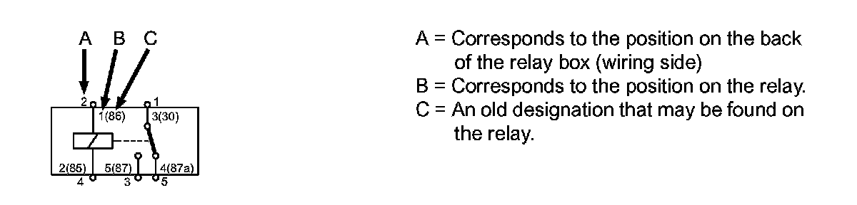 The diagram indicates two or three different designations for the relay's position. This is described below.