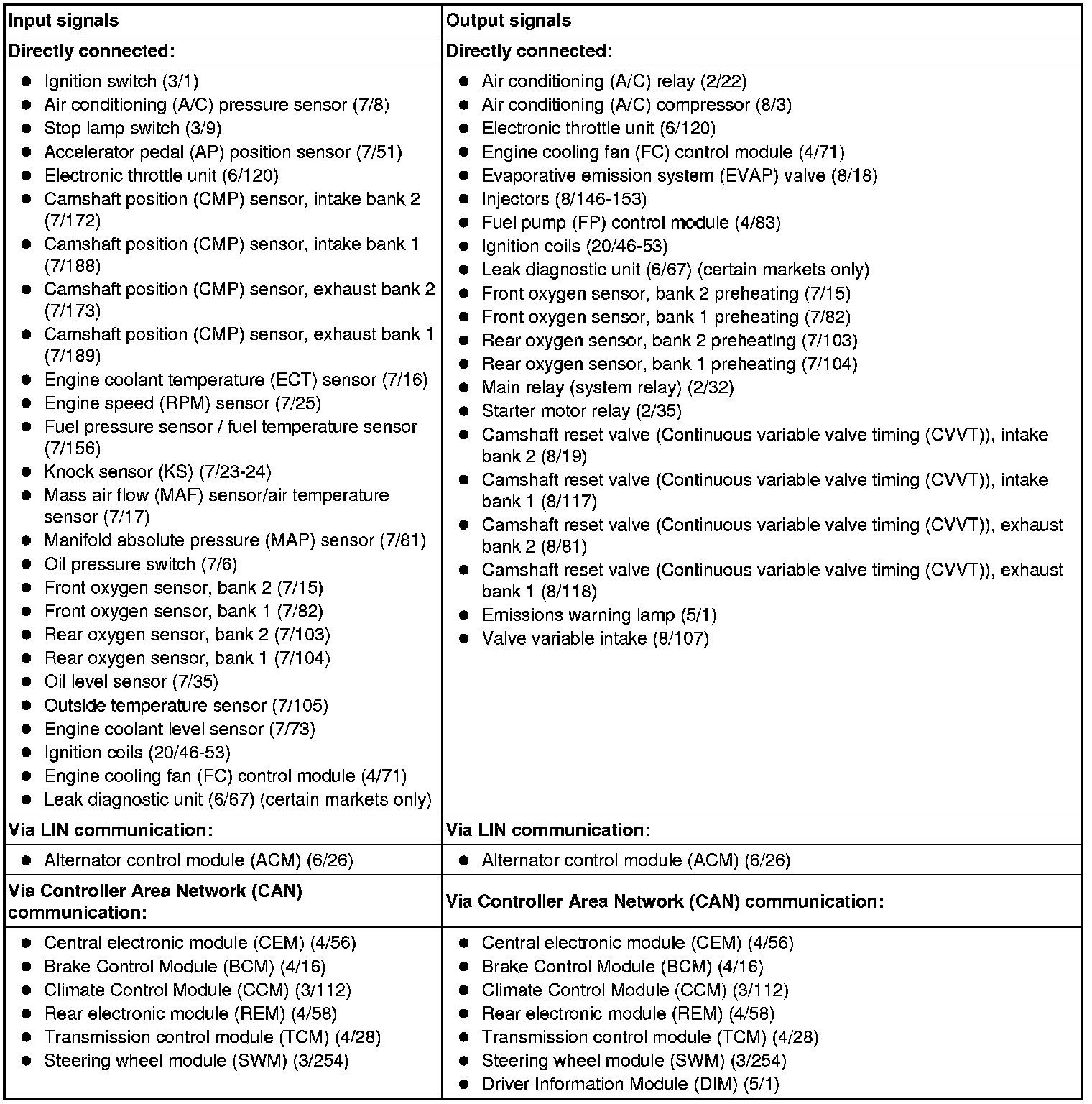 The table below summarizes the input signals to and output signals from the Engine Control Module (ECM). The signal types are divided into directly connected signals, LIN and controller area network (CAN) communication. The illustration below displays the same information with the Volvo component designations.