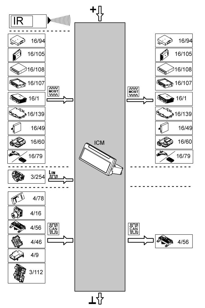 The infotainment control module (ICM) acts as a gateway between the CAN and MOST networks. It also acts as the master control module in the MOST network and checks the other control modules.