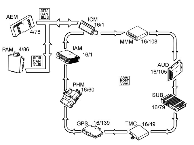 The integrated audio module (IAM) functions as a stereo system in the vehicle and is connected to other control modules on the MOST network.