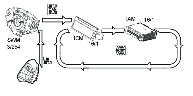 The steering wheel remote control (standard/option) is directly connected to the steering wheel module (SWM) via serial communication. The remote control can be used to change volume (increase/decrease) and change the preset radio stations. During CD, cassette or MD playback, the buttons are used for track selection. The steering wheel module (SWM) uses the CAN network to communicate with the infotainment control module (ICM), which then sends the signals on to the integrated audio module (IAM) via the MOST network.