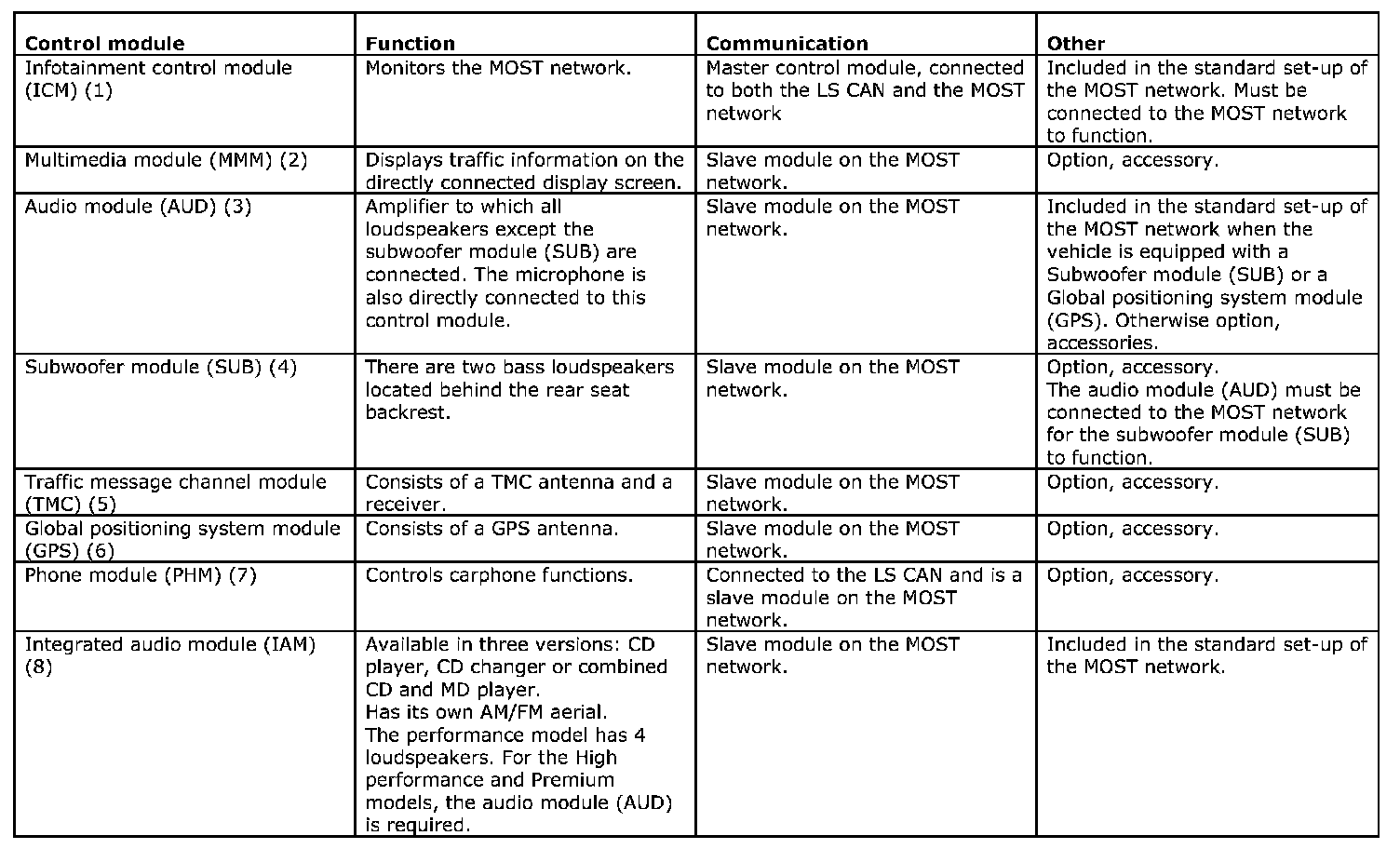 The table below lists all the control modules which may be included in the MOST network for the C70.