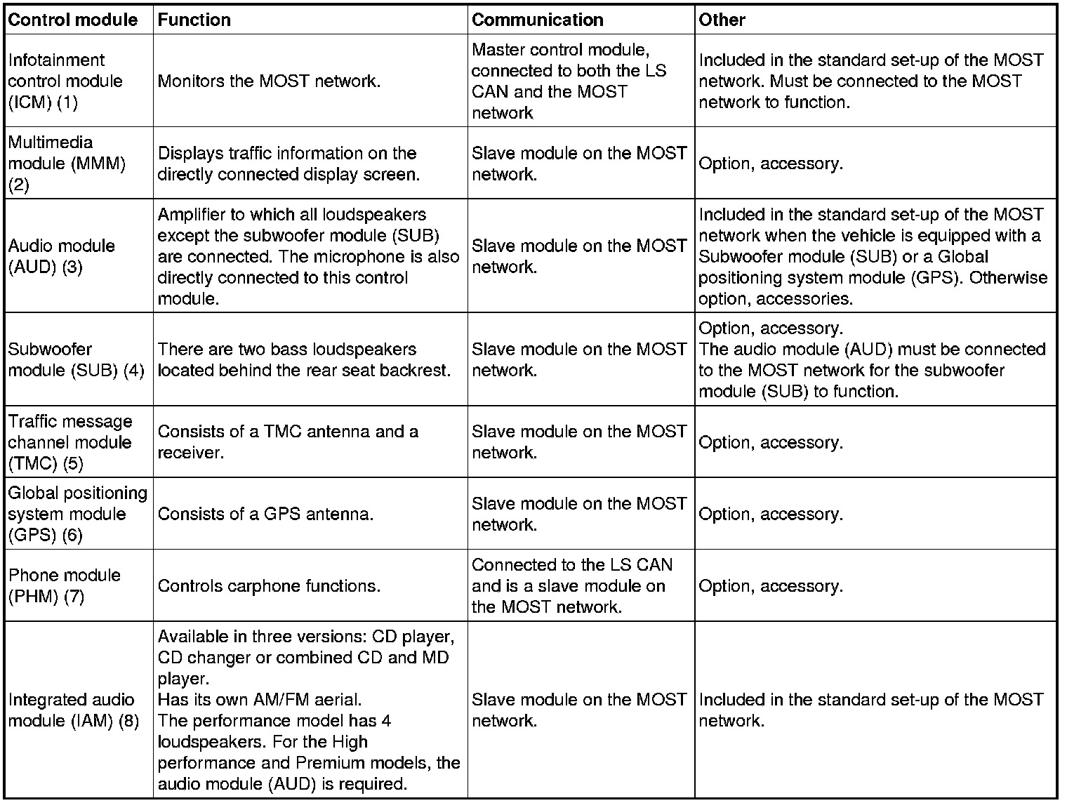 The table below lists all the control modules which may be included in the MOST network for the C70.