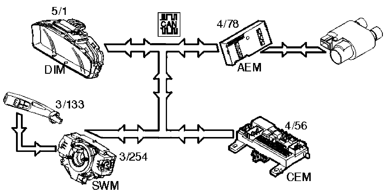 The left-hand control stalk controls the start timer for the parking heater (3/133). No other timer is required when setting the timer control. The control stalk is directly connected to the steering wheel module (SWM) (3/254) which transmits a signal via the Controller area network (CAN) to the central electronic module (CEM) (4/56), which in turn transmits the signal on to the accessory electronic module (AEM) (4/78) when the electrical heater is to start.