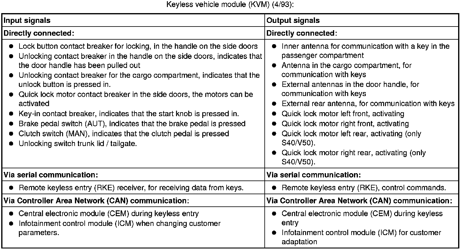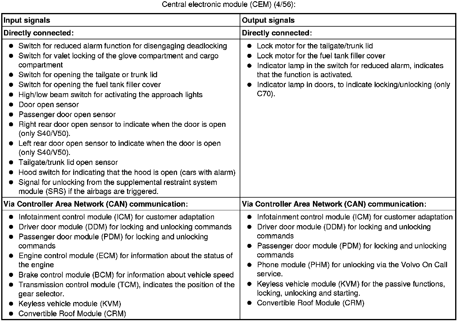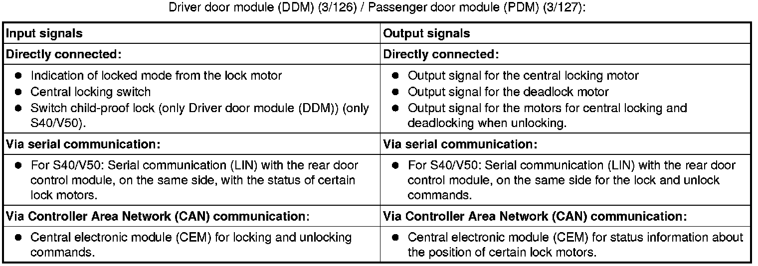 The tables below summarize the input and output signals to the units in the central locking system. The signal types are divided into directly connected signals, serial communication and controller area network (CAN) communication.