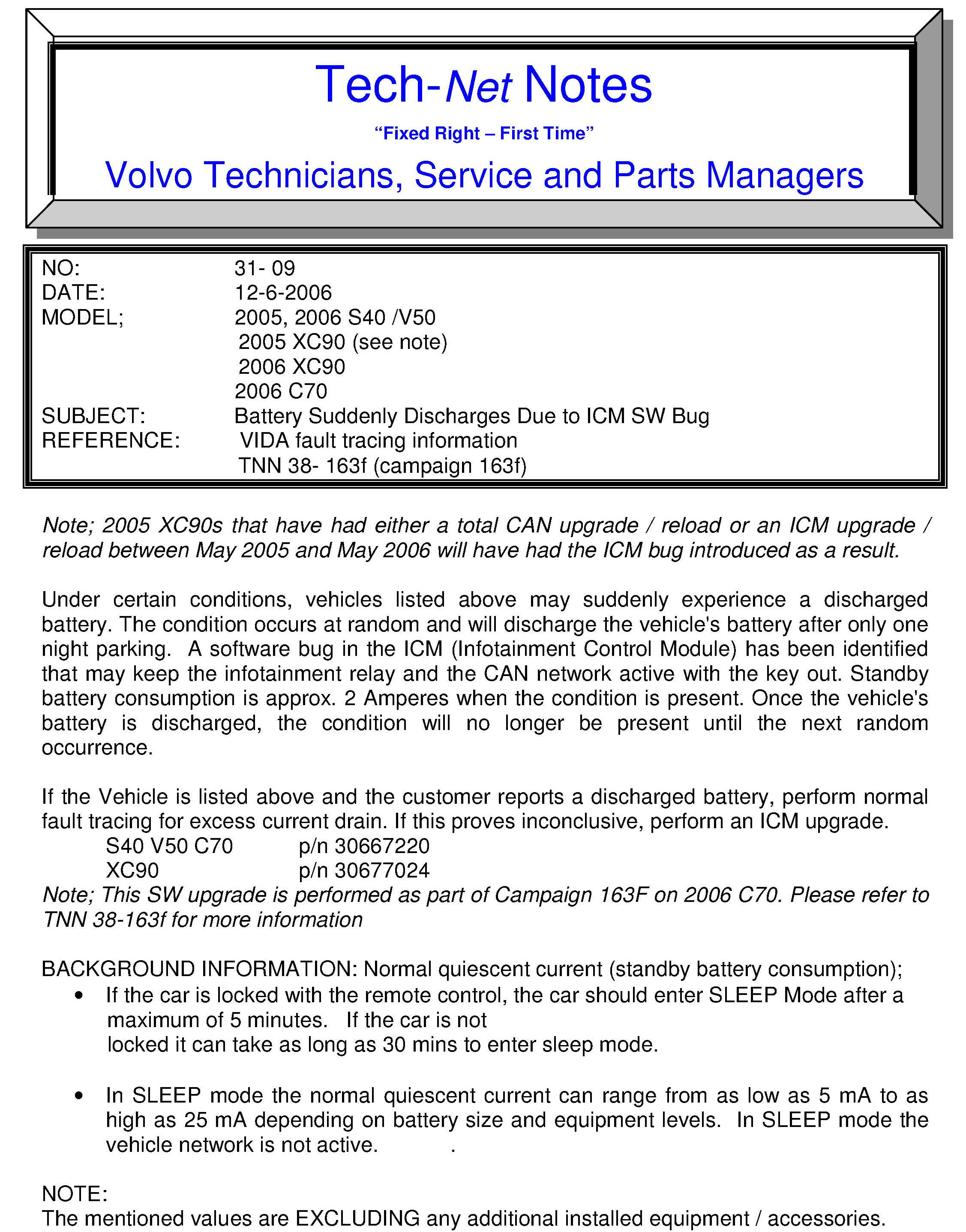 Under certain conditions vehicles listed above may suddenly experience a discharged battery. The condition occurs at random and will discharge the vehicle's battery after only one night parking. A software bug in the ICM (Infotainment Control Module) has been identified that may keep the infotainment relay and the CAN network active with the key out. Standby battery consumption is approx. 2 Amperes when the condition is present. Once the vehicle's battery is discharged the condition will no longer be present until the next random occurrence.