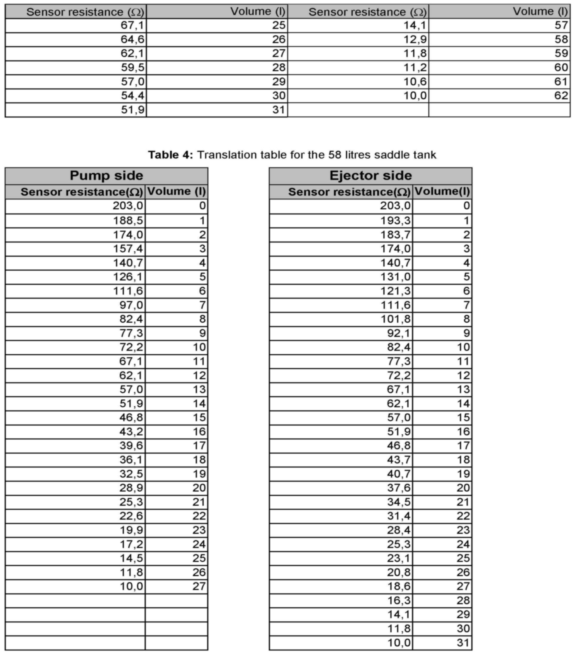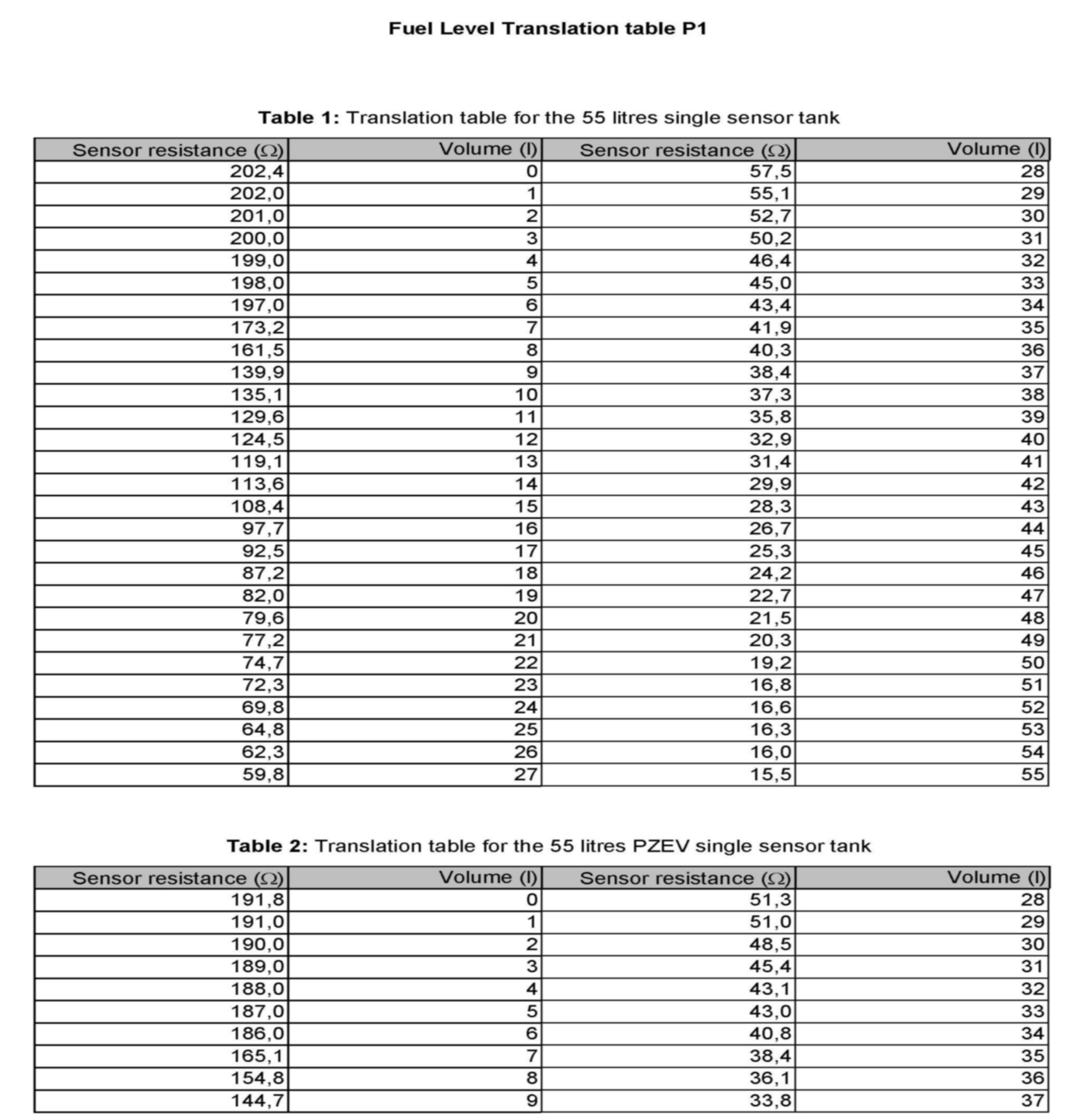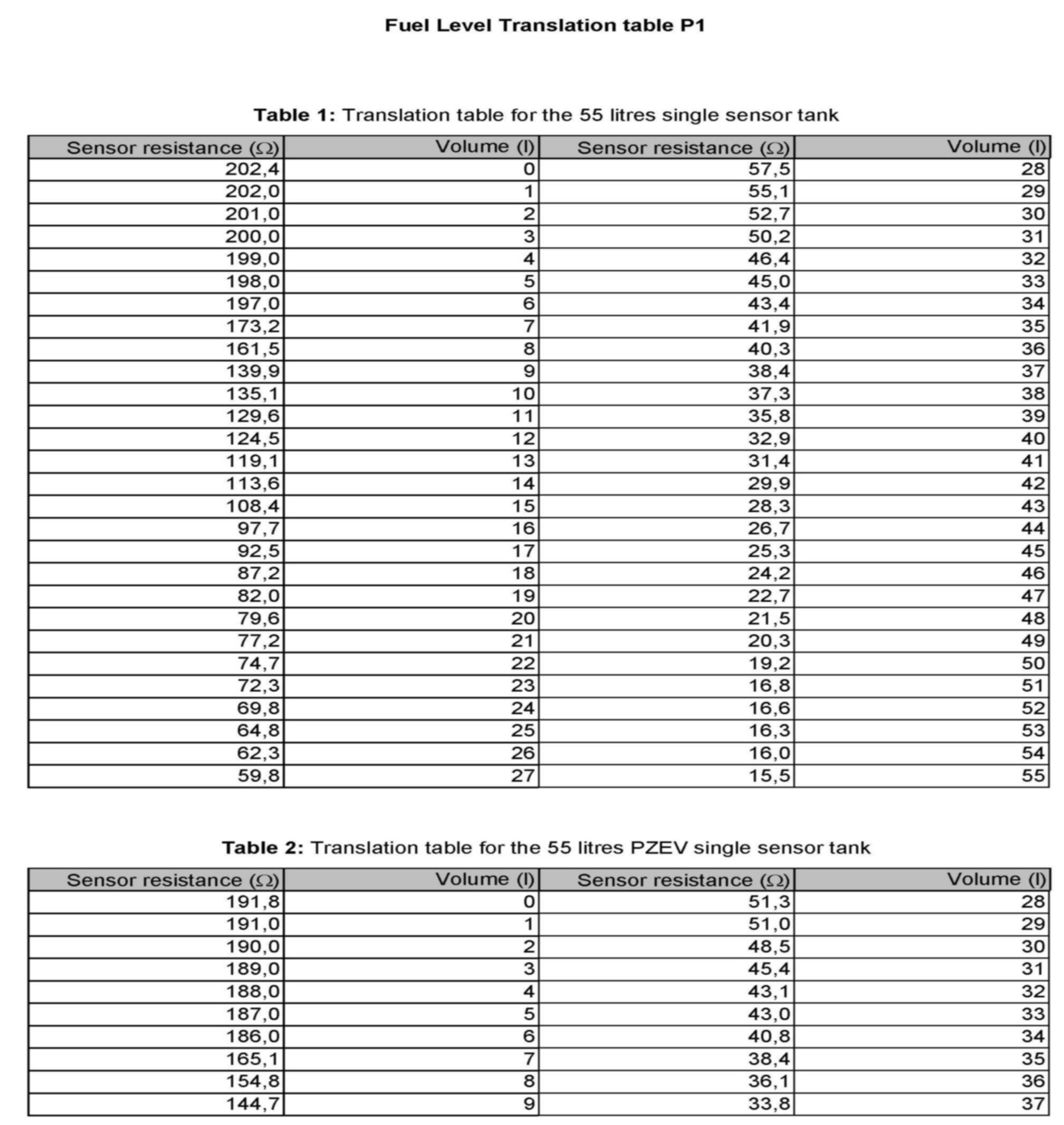 Fuel Level Translation table P1