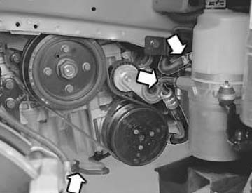 Unhook the auxiliaries belts. Turn up the belt tensions and lift off the belts. Use: 999 7109. Remove the screws for the air conditioning (A/C) compressor. Disconnect the connector. Hook the compressor in the radiator member. Lower the vehicle.