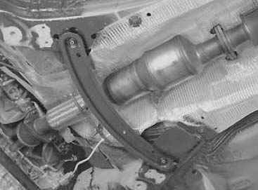 Unhook the three-way catalytic converter (TWC) in the sub-frame. Disconnect the connector for the rear heated oxygen sensor (HO2S). Detach the cable harness from the sub-frame.