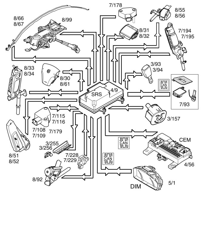 The supplemental restraint system module (SRS) transmits information via the controller area network (CAN) to the driver information module (DIM) (5/1) indicating that this test is in progress. The central electronic module (CEM) (4/56) also transmits the parameter values during the status check.