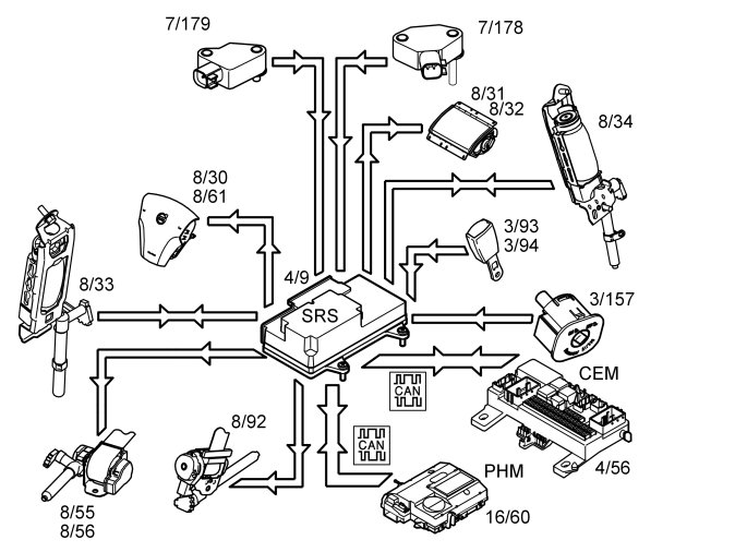 The control module also transmits a collision signal on a directly connected cable to the central electronic module (CEM) (4/56) and the phone module (PHM) (16/60), so that these control modules can take certain actions.