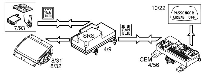In normal conditions it is the information from the Occupant weight sensor (OWS) (7/93) that is the basis for if the Supplemental restraint system module (SRS) (4/9) shall activate or deactivate the front passenger airbag (8/31 and 8/32). Occupant weight sensor (OWS) communicates continuously with Supplemental restraint system module (SRS) on the local CAN-network. When a passenger is seated, with a weight exceeding a certain level, in the passenger seat the Occupant weight sensor (OWS) will inform the Supplemental restraint system module (SRS) about this. Then the control module's software activates the front passenger airbag, which means that the airbag has full function in case of a collision. At the same time, the Supplemental restraint system module (SRS) sends a signal on the CAN-network, to the central electronic module (CEM) (4/56), with a request that the warning light passenger airbag (PAD) shall be turned off. Then the Central electronic module (CEM) turns off the warning light for passenger airbag (PAD).