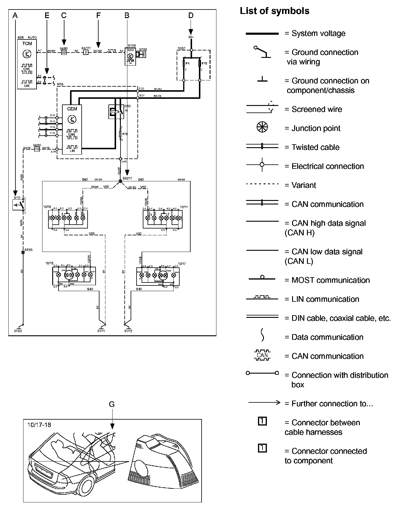 Today's cars contain CAN and MOST networks that transfer information. Connections to these networks are not shown in their entirety in the respective wiring diagram. Complete information on CAN and MOST communication is found in the "Control modules" in the Information Bus.