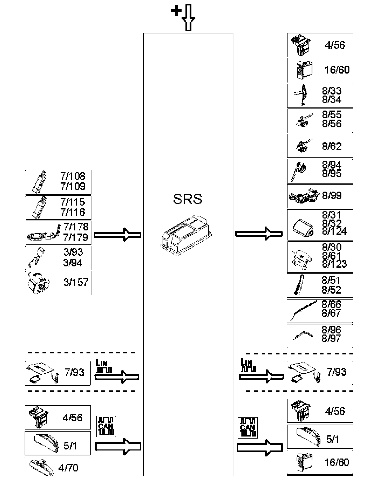 The table below summarizes the input signals to and output signals from the supplemental restraint system module (SRS). The signal types are divided into directly connected signals, LIN and CAN communication. The illustration below displays the same information with the Volvo component designations.